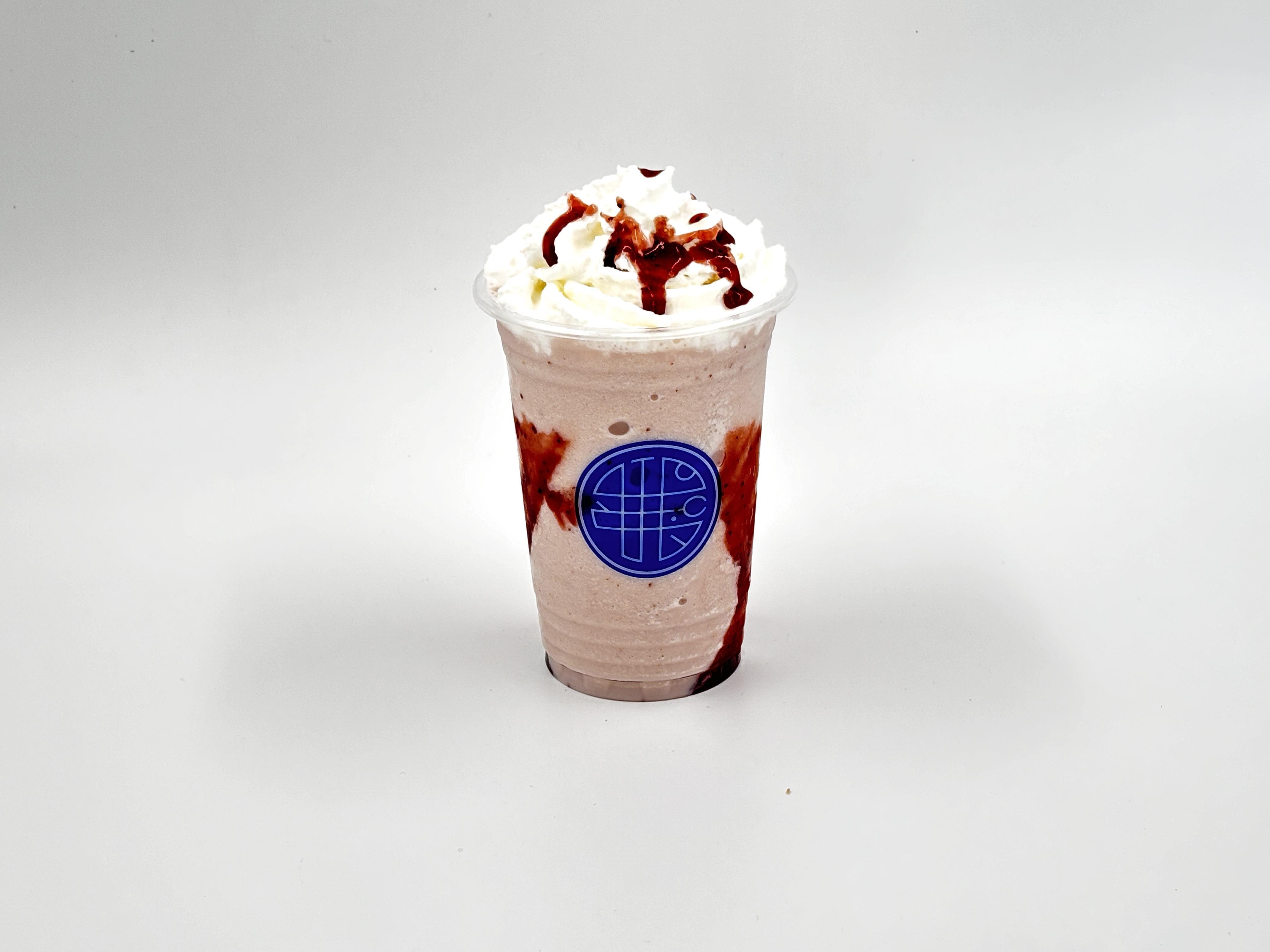 الثلج الممزوج مع الحليب الكريمي وشراب الفراولة الحلو يتناغم في فريب كريمة الفراولة الرغوي، ويُزيّن بالكريمة المخفوقة لمتعة فاكهية لذيذة